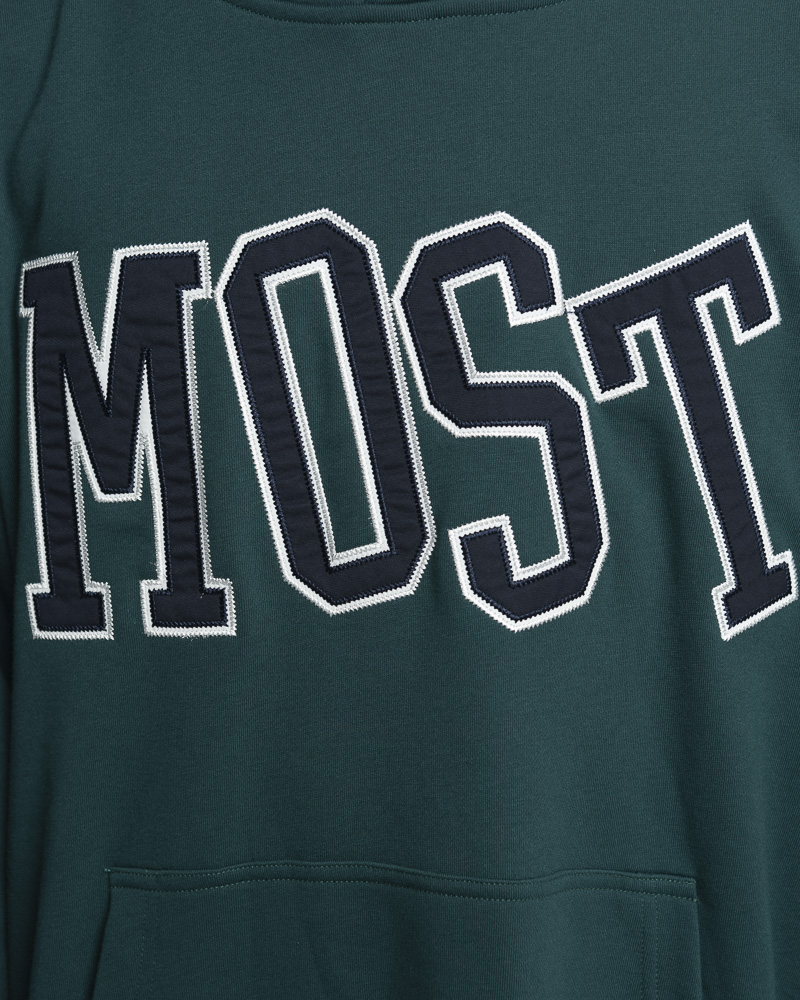 Regular Solid Coloured Long Sleeve Pullover Hoodie with Kangaroo Pockets at the front. Comes with MOST Slogan Patch at the front. Made of cotton.